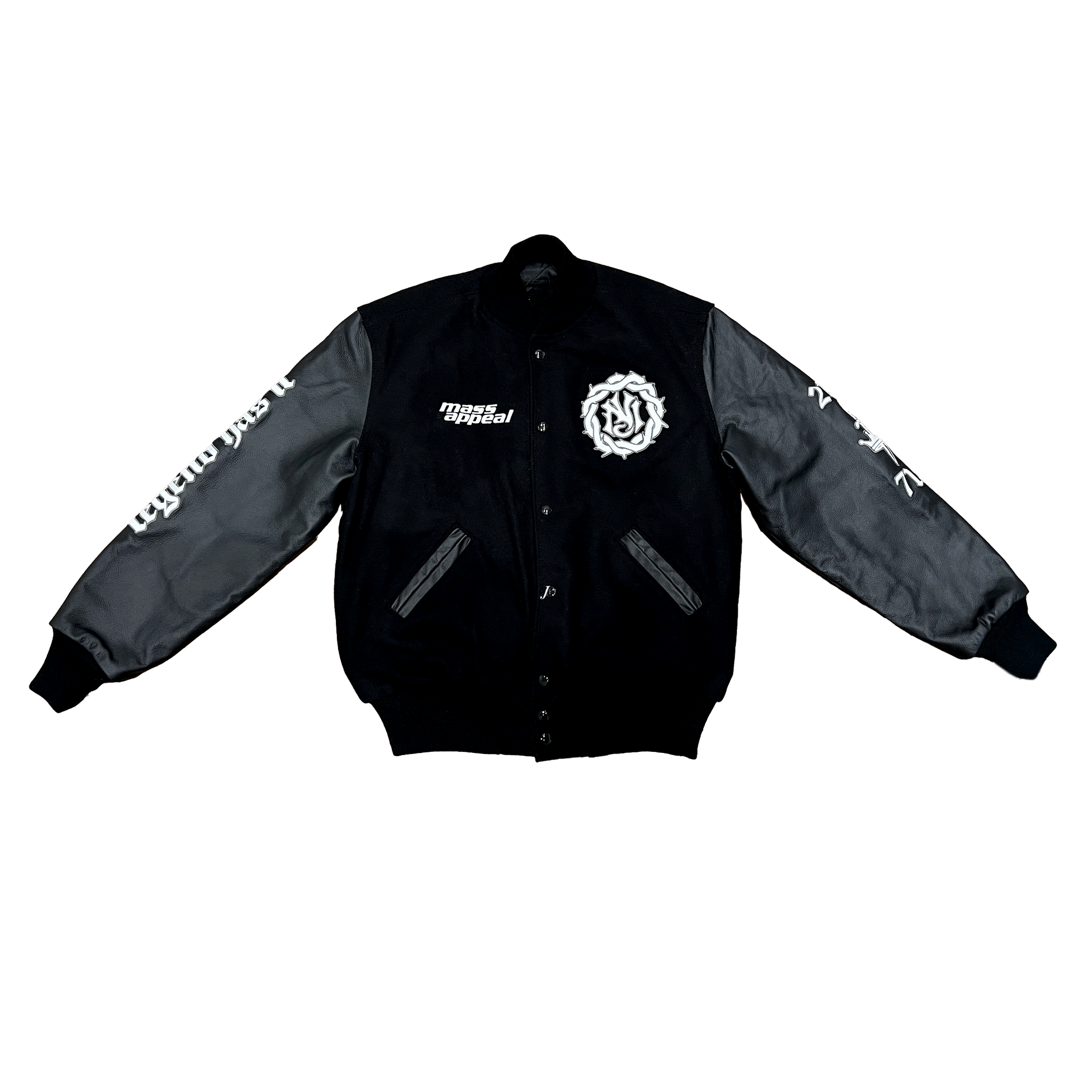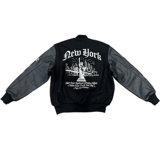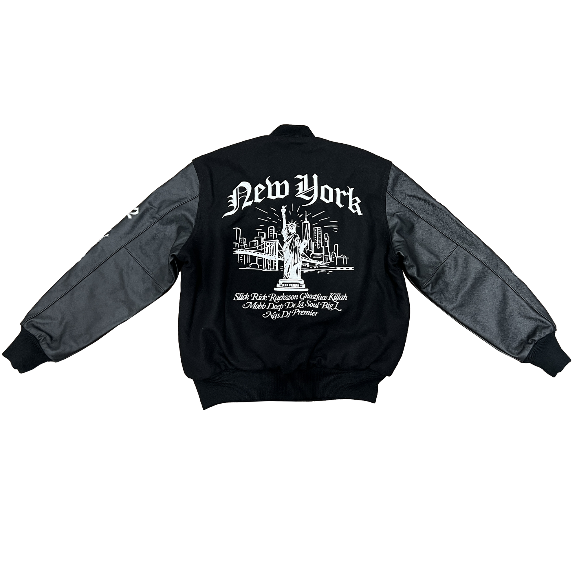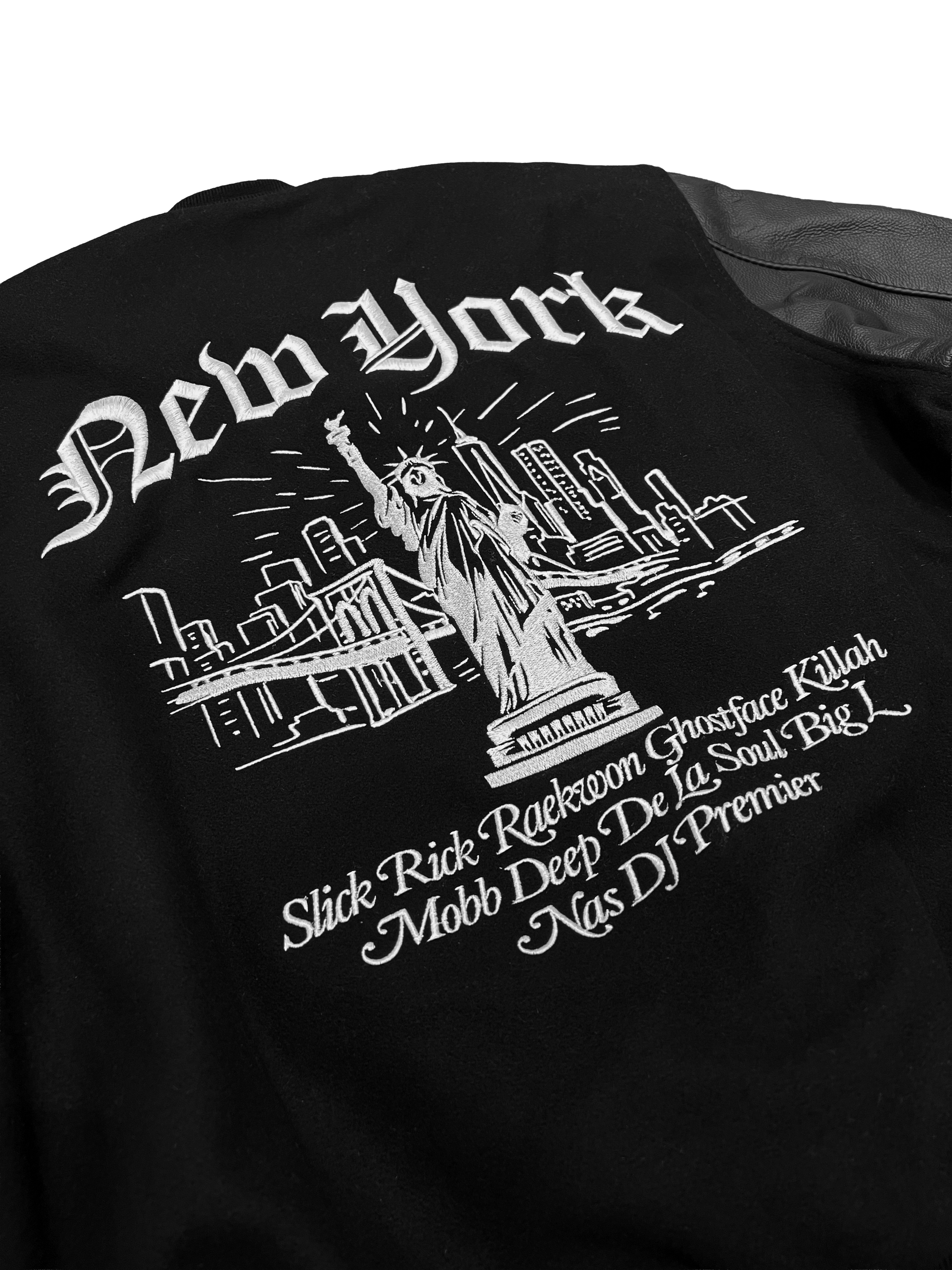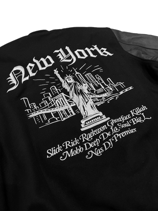 As seen on Nas, De La Soul & more, this exclusive varsity jacket - originally made only for our “Legend Has It…” artists - is now available for purchase in limited quantities. Composed of wool with genuine leather sleeves, the jacket features fully embroidered graphics on the front, back and sleeves honoring our “Legends” and New York City.