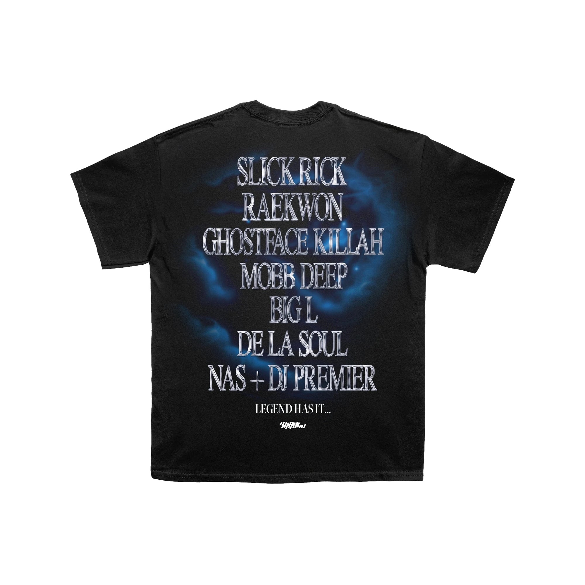 This exclusive t-shirt features all 7 logos of the artists involved, within the gold rings design on the front, as well as the lineup of their names on the back: Slick Rick, Raekwon, Ghostface Killah, Big L, De La Soul & Nas + DJ Premier