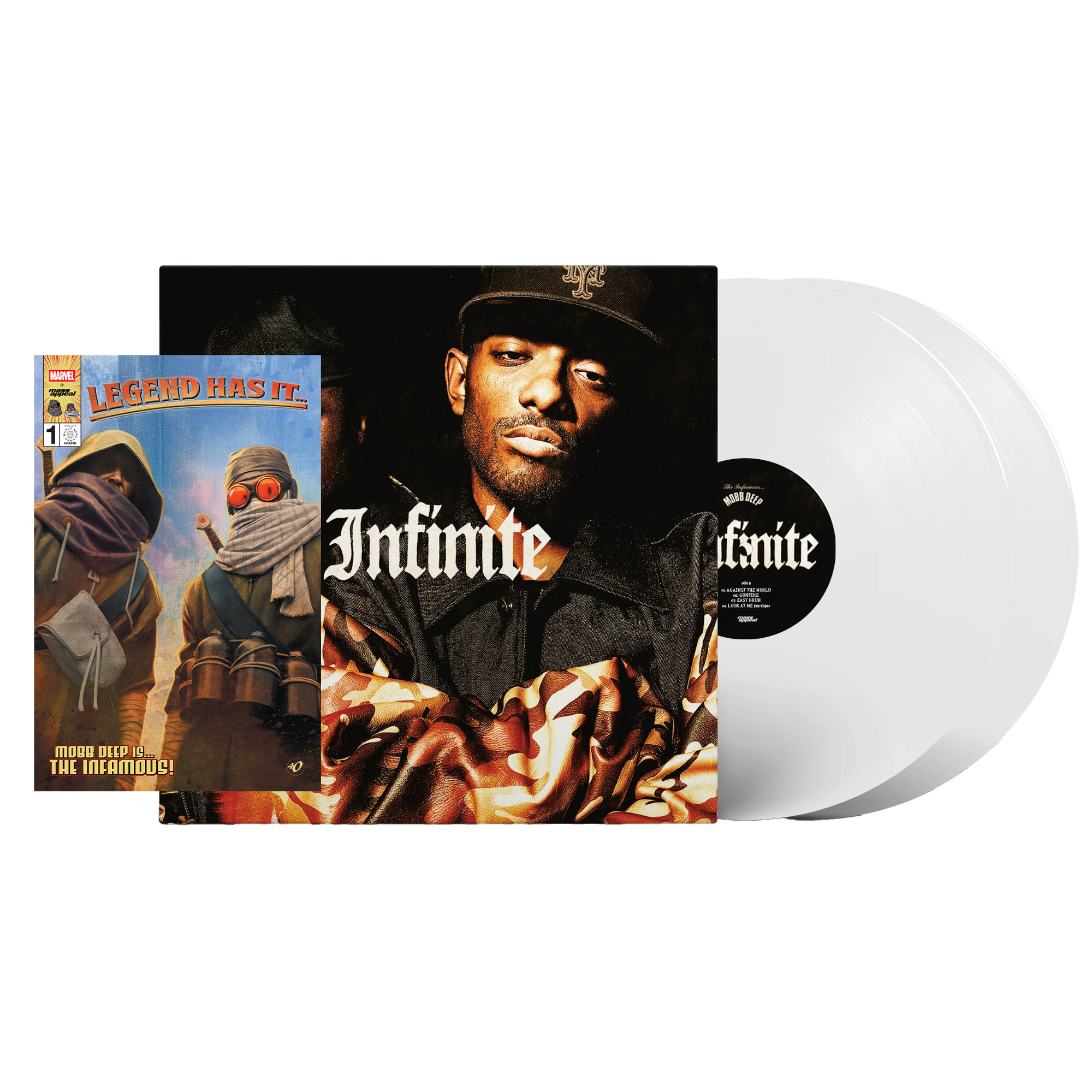 This bundle includes a limited edition Variant Edition of the SOLD OUT 1st issue of Legend Has It... features brand new art by Ariel Olivetti and Mobb Deep on the cover and the standard edition of the epic 'Infinite' 2x Vinyl LP.